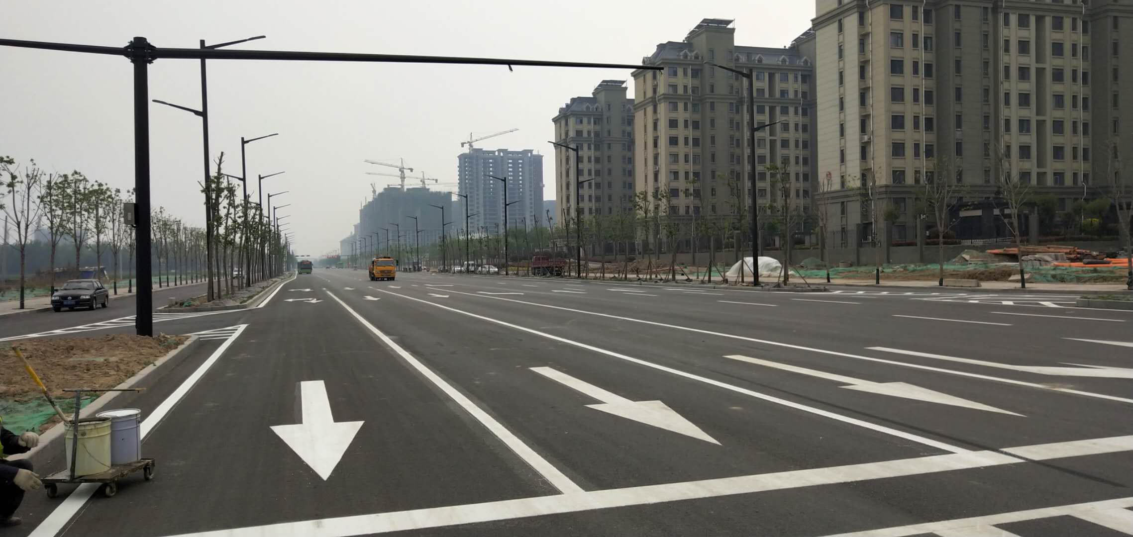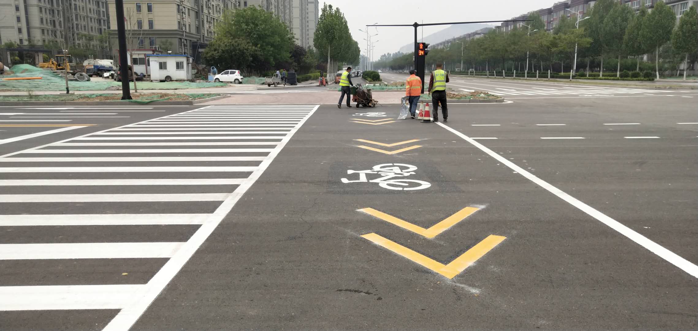 交通道路标线是将标饯凃喷涂或刮涂于路面上,用来管制和引导交通的设施,它是由标划于路面上的各种线条、箭头、文字、立面标记、突起路标等所构成的。用于施划路面的涂料分为溶剂型、热熔型、双组份、水性四种如果路面标线有反光要求,则在施工时,还应在涂料中掺入或在施工时而撒玻璃珠。其中,热熔型标线具有反射能力强,色彩鲜明,反光度强,施工时千燥时间短,操作简单,减少交通千挠等特点,其性能明显优于其它型标线。